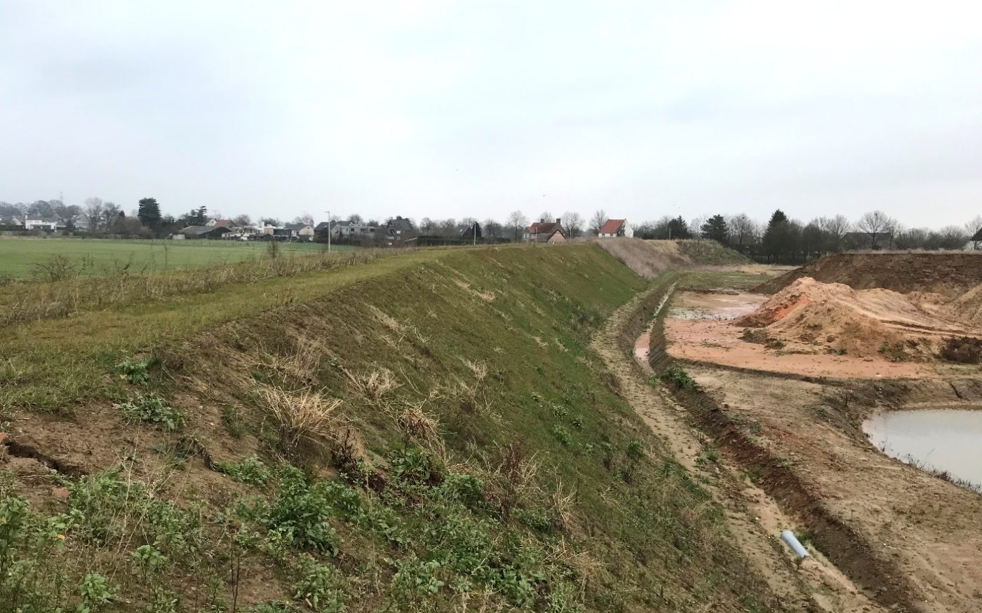 Onderstaande luchtfoto toont schetsmatig het volledige inrichtingsplan voor de site Wienerberger Maaseik. Daarnaast enkele foto’s van de recent aangelegde grondwal langs de noordelijke zijde van het fabrieksterrein, waarop deels streekeigen beplanting zal worden voorzien en de grazige vegetatie mits gepast beheer verder kan ontwikkelen.