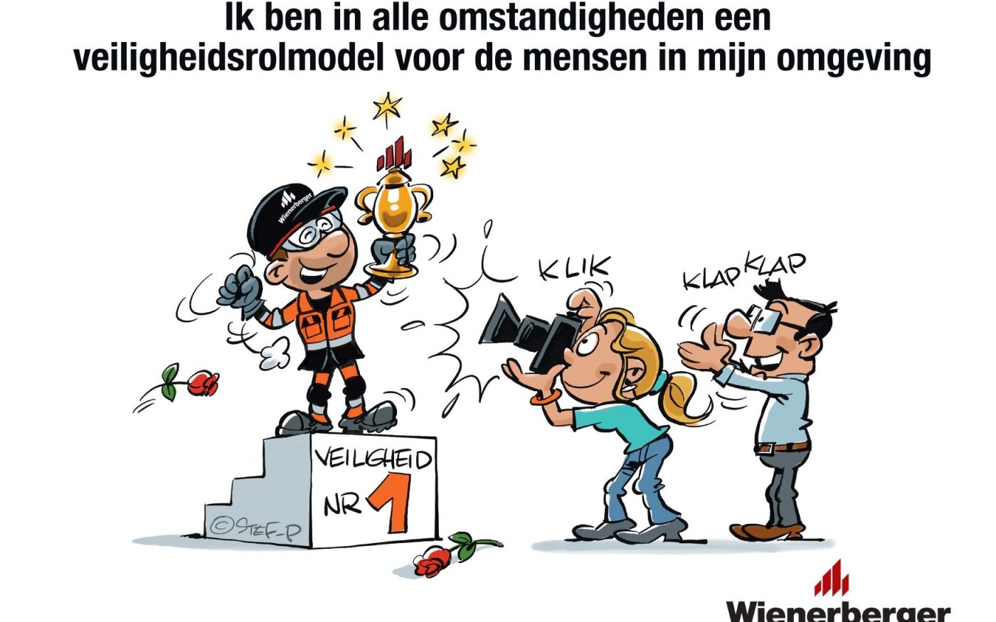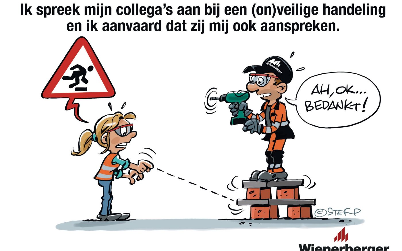 Het aanpassen van ons gedrag tegenover eventuele risico’s is eveneens belangrijk. In 2020 lanceerden we daarom een interne veiligheidscampagne. Er werd een ‘werkgroep veiligheidscultuur’ opgericht, met als doel een vooruitstrevende veiligheidscultuur te ontwikkelen. Om dat doel te helpen bereiken, stelden we veiligheidsambassadeurs aan, en werd er een veiligheidsmascotte ontwikkeld. Die mascotte wordt intussen op alle veiligheidscommunicatie gebruikt. Er werden ook 7 cruciale veiligheidsgedragingen ontwikkeld; veilig gedrag dat op termijn elke medewerker zou moeten stellen. In 2023 werden daar ook cartoons (foto's hieronder) bij ontwikkeld, om de veiligheidsgedragingen visueel te verduidelijken.