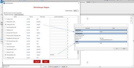 - Lien vers vos propres définitions des paramètres: Pour les utilisateurs qui travaillent avec leurs propres définitions des paramètres, le mappeur offre la possibilité de coupler aux paramètres souhaités les propriétés proposées par Wienerberger pour les reprendre dans le modèle BIM. Permettant ainsi une intégration parfaite de vos propres définitions avec les données fournies par nos soins.
