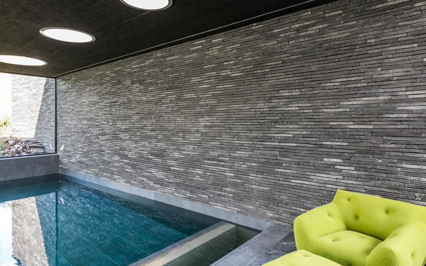 Les murs sur toute la largeur de la maison ont été réalisés avec Terca Wasserstrich Special Noir de Volcan, une brique de parement noir mat non-sablée et irrégulière avec des nuances de gris.