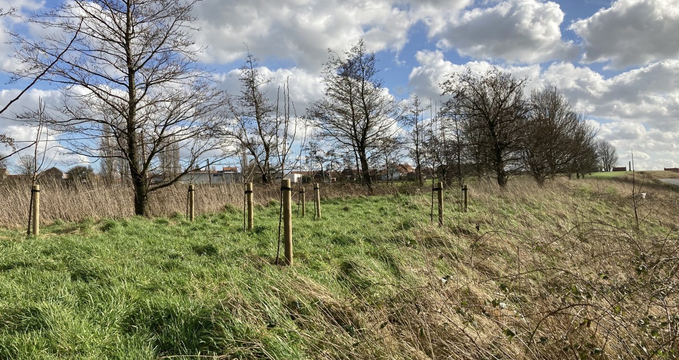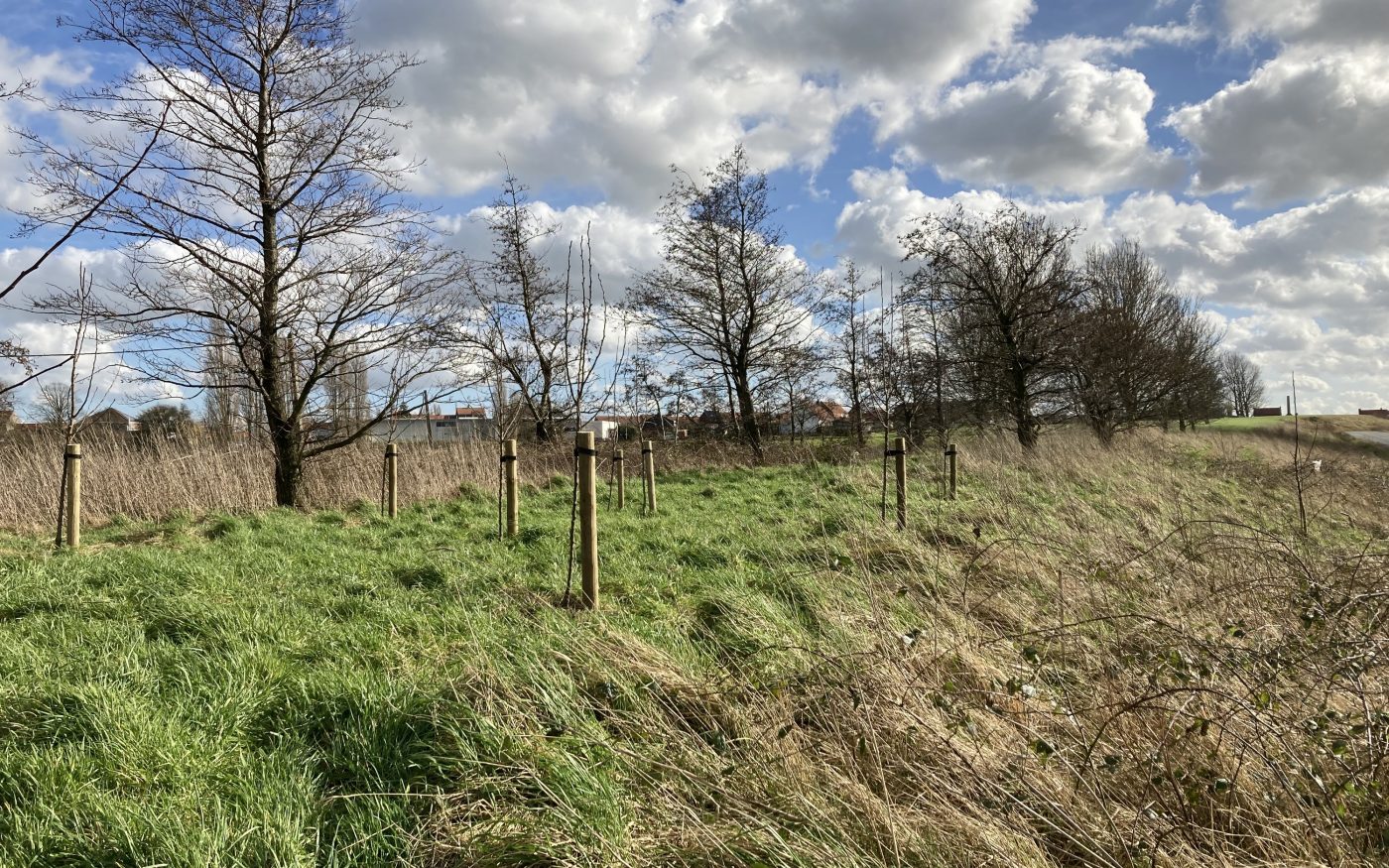 Nous avons planté une parcelle de prairie avec des buissons et arbustes à baies et à fruits. La végétation peut proliférer dans l’espace intermédiaire. Cela crée une ‘wastine’, un paysage assez dégarni avec ci et là des petits groupes de taillis. Diverses espèces animales peuvent s'y installer et les papillons aiment aussi y batifoler.