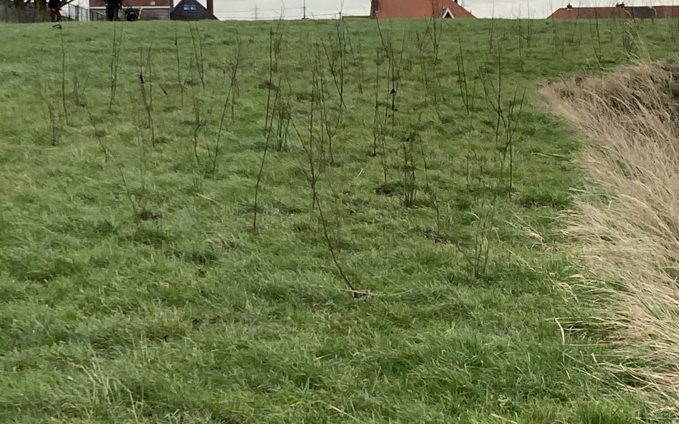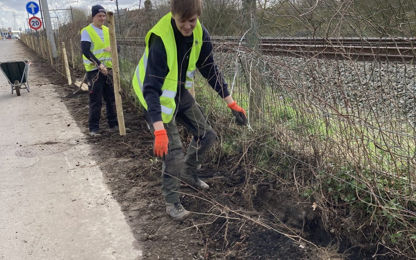 Là où le site borde la voie ferrée étaient jadis entreposées des palettes résiduelles. Celles-ci ont été déblayées pour y planter une haie constituée de végétation indigène. Avec des variétés très fleuries (pour les abeilles/ syrphes/papillons), mais aussi fruitières, notamment pour le lérot.