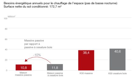 Les besoins énergétiques annuels pour le chauffage dans une maison massive passive sont environ 10% moins élevés que pour une maison passive à ossature bois similaire.