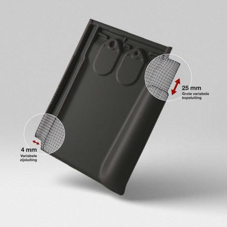 De Tegelpan Elfino van Koramic combineert de ranke look van een lei met de uitmuntende prestaties van een keramische dakpan. Ze laat zich vlot plaatsen, is UV-bestendig en heeft een lange levensduur, ondersteund door een garantie van 30 jaar. Ook ecologisch scoort ze uitstekend. Karakteristiek voor de fijne Tegelpan Elfino is haar dunne voetzijde. In combinatie met de aangepaste breedte van de vorst levert dat een dak op dat gewoon lijkt door te lopen.